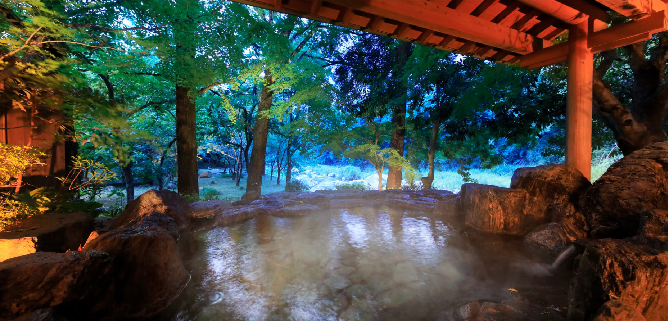 Open air bath森を眺め、川のせせらぎを聞きながら味わう川に面した露天風呂では、座っても寝そべっても森や川が見渡せる設計で、四季折々の景色を長時間楽しめます。