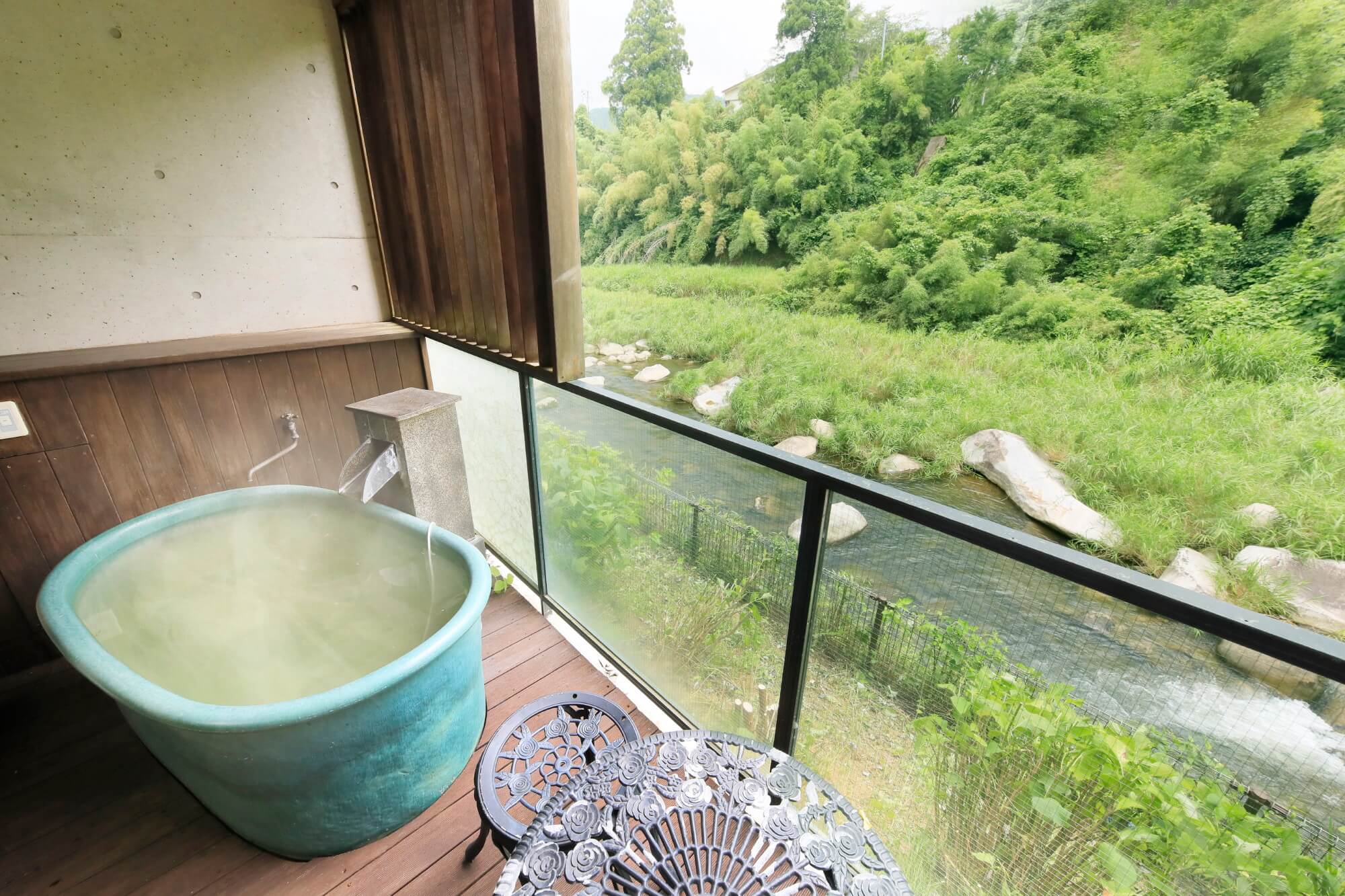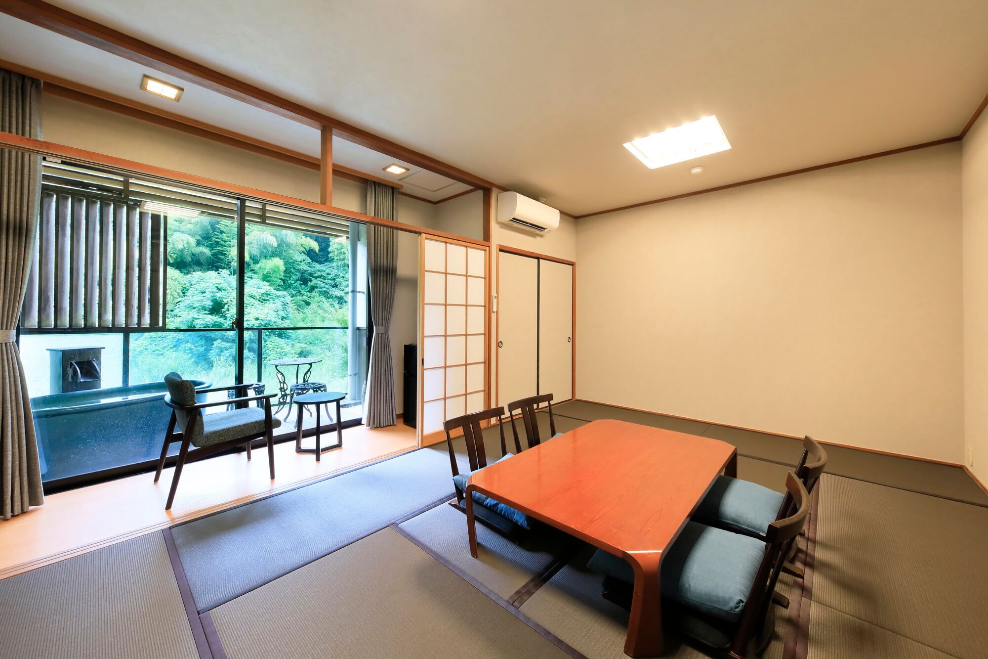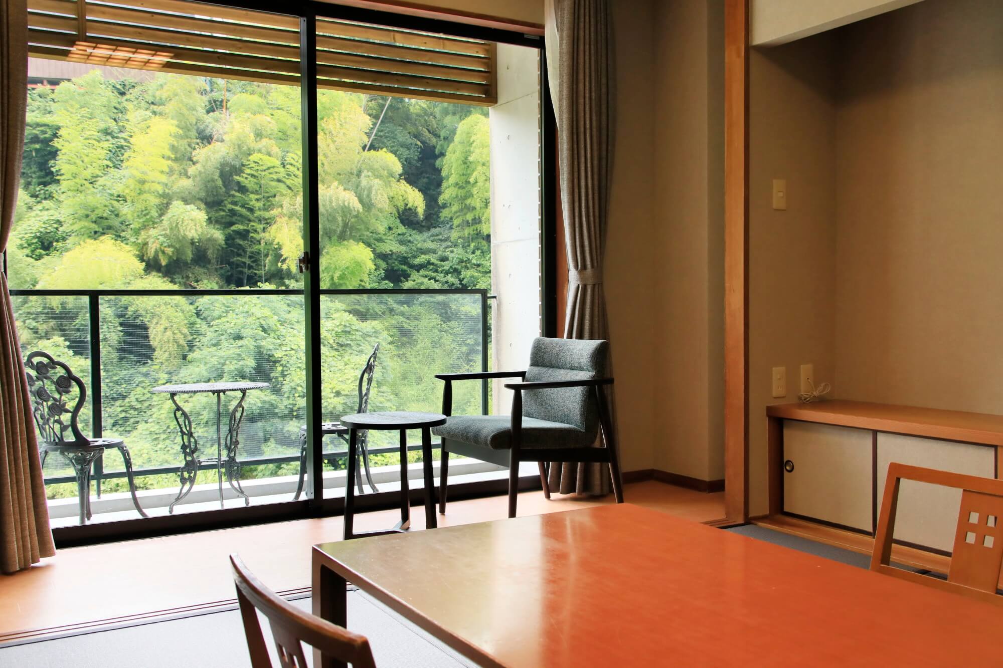 8-Tatami Japanese Room with Open-Air Bath嘉瀬川を望む露天風呂を設えた和室です。四季の風を感じながらお寛ぎいただけます。