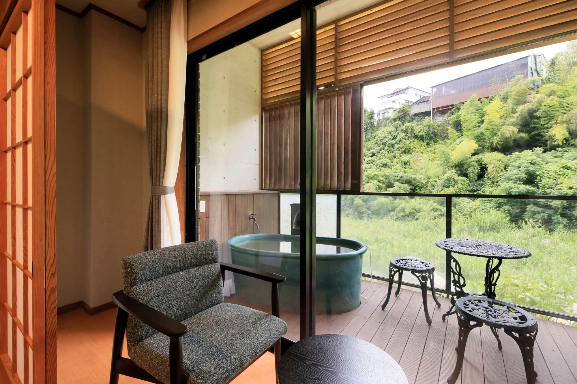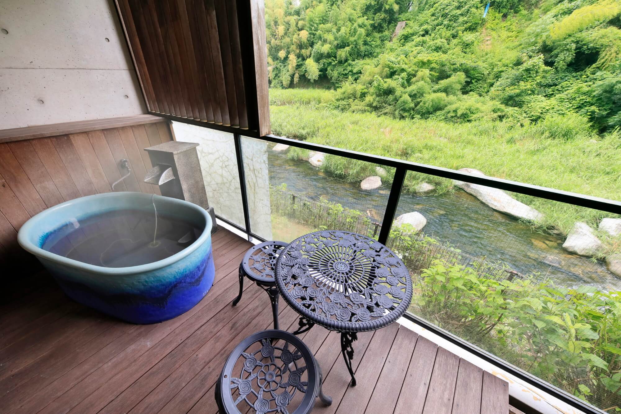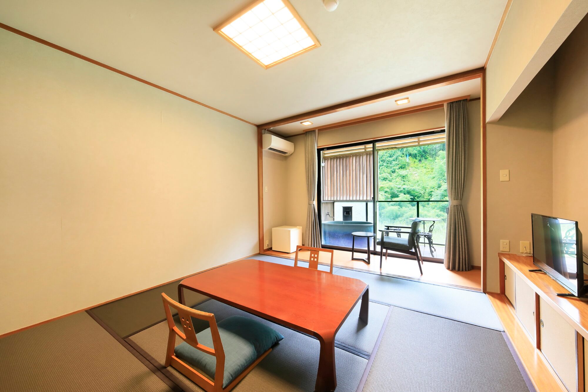 8-Tatami Japanese Room with Open-Air Bath嘉瀬川を望む露天風呂を設えた和室です。四季の風を感じながらお寛ぎいただけます。